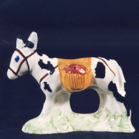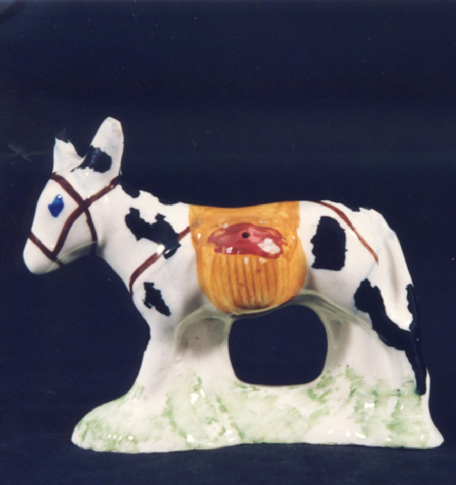 "Palillero" en forma de burro de cor branca con manchas negras. Os ollos son dúas manchas azuis e leva alforxas amarelas e vermellas en cada unha das cales hai tres orificios para os escarvadentes.