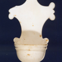 Benditera no segundo paso da súa fabricación, en biscoito: despois de ser moldeada e ensambladas as dúas partes das que consta enfornouse a 1.000º C. A peza, así, estaría lista para estampar posteriormente, pero non chegou a terminarse.