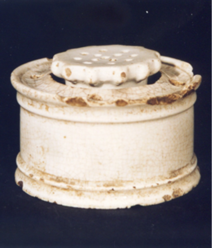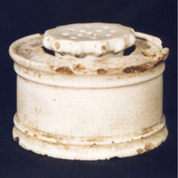 - Recipiente de forma cilíndrica, moldurada, carece de decoración estampada. Fáltalle a tapadeira.