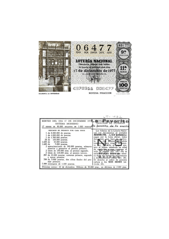 Décimo da Lotaría Nacional de 1977 co motivo "As provincias españolas": imaxe que representa a Universidade de Salamanca. O número do décimo é o 06477 / ANVERSO. Impresión / 06477 / Lotería Nacional. Décima parte del billete para el sorteo del día 17 de diciembre de 1977 / El jefe del servicio (sinatura) / 4970911 - 006477 / 49/77 / 9ª fracción / 11ª serie / Precio 100 pesetas / Salamanca. La Universidad (imaxe) / Novena fracción / Fca. Nal. de Moneda y Timbre / REVERSO. Impresión / Sorteo del día 17 de diciembre 1977. Sistema moderno. 17 series de 80.000 billetes de 1.000 pesetas. (Resumo de premios) / Extracto de la instrucción de Loterías (texto) / Próximo sorteo: 22 de diciembre. Billetes de 20.000 ptas., en décimos de 2.000 ptas