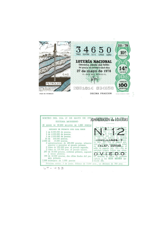 Décimo da Lotaría Nacional de 1978 co motivo "Os Recursos naturais": imaxe que representa un pozo de petróleo. O número do décimo é o 34650 / ANVERSO. Impresión / 34650 / Lotería Nacional. Décima parte del billete para el sorteo del día 27 de mayo de 1978 / El jefe del servicio (sinatura) / 2081014 - 034650 / 20/78 / 10ª fracción / 14ª serie / Precio 100 pesetas / Pozo de petróleo (imaxe) / Décima fracción / Fca. Nal. de Moneda y Timbre / REVERSO. Impresión / Sorteo del día 27 de mayo de 1978. Sistema moderno. 18 series de 80.000 billetes de 1.000 pesetas. (Resumo de premios) / Extracto de la instrucción de Loterías (texto) / Próximo sorteo: 3 de junio. Billetes de 5.000 ptas., en décimos de 500 ptas