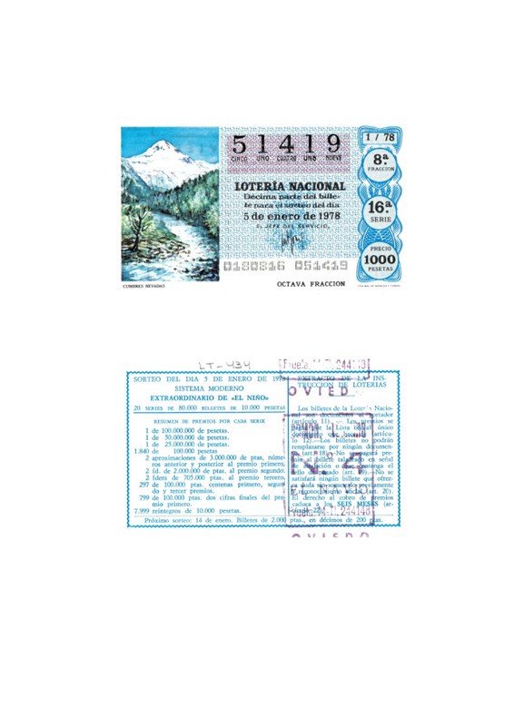 Décimo "Extraordinario do Día do Neno" da Lotaría Nacional de 1978 co motivo "Os Recursos naturais":imaxe que representa unhas cumes nevadas. O número do décimo é o 54419 / ANVERSO. Impresión / 51419 / Lotería Nacional. Décima parte del billete para el sorteo del día 5 de enero de 1978 / El jefe del servicio (sinatura) / 0180816 - 051419 / 1/78 / 8ª fracción / 16ª serie / Precio 1000 pesetas / Cumbres nevadas (imaxe) / Octava fracción / Fca. Nal. de Moneda y Timbre / REVERSO. Impresión / Sorteo del día 5 de enero de 1978. Sistema moderno. Extraordinario de "El Niño". 20 series de 80.000 billetes de 10.000 pesetas. (Resumo de premios) / Extracto de la instrucción de Loterías (texto) / Próximo sorteo: 14 de enero. Billetes de 2.000 ptas., en décimos de 200 ptas