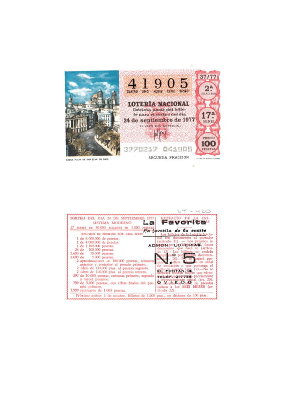 Décimo da Lotaría Nacional de 1977 co motivo "As provincias españolas": imaxe que representa a Praza de San Xoán de Deus, en Cádiz. O número do décimo é o 41905 / ANVERSO. Impresión / 41905 / Lotería Nacional. Décima parte del billete para el sorteo del día 24 de septiembre de 1977 / El jefe del servicio (sinatura) / 3770217 - 041905 / 37/77 / 2ª fracción / 17ª serie / Precio 100 pesetas / Cádiz. Plaza de San Juan de Dios (imaxe) / Segunda fracción / Fca. Nal. de Moneda y Timbre / REVERSO. Impresión / Sorteo del día 24 de septiembre 1977. Sistema moderno. 17 series de 80.000 billetes de 1.000 pesetas. (Resumo de premios) / Próximo sorteo: 1 de octubre. Billetes de 1.000 ptas., en décimos de 100 ptas