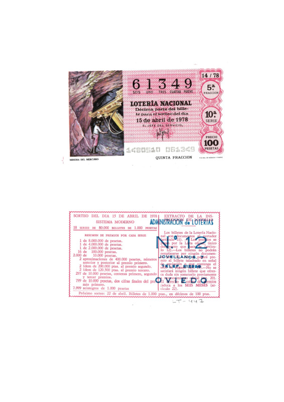 Décimo da Lotaría Nacional de 1978 co motivo "Os Recursos naturais": imaxe que representa a minería de mercurio. O número do décimo é o 61349 / ANVERSO. Impresión / 61349 / Lotería Nacional. Décima parte del billete para el sorteo del día 15 de abril de 1978 / El jefe del servicio (sinatura) / 1480510 - 061349 / 14/78 / 5ª fracción / 10ª serie / Precio 100 pesetas / Minería del mercurio (imaxe) / Quinta fracción / Fca. Nal. de Moneda y Timbre / REVERSO. Impresión / Sorteo del día 15 de abril de 1978. Sistema moderno. 18 series de 80.000 billetes de 1.000 pesetas. (Resumo de premios) / Extracto de la instrucción de Loterías (texto) / Próximo sorteo: 22 de abril. Billetes de 1.000 ptas., en décimos de 100 ptas