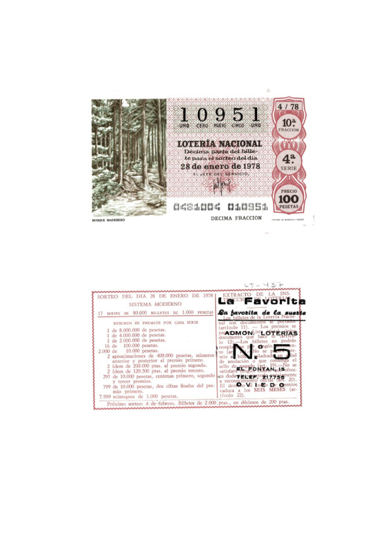 Décimo da Lotaría Nacional de 1978 co motivo "Os Recursos naturais": imaxe que representa un bosque madereiro. O número do décimo é o 10951 / ANVERSO. Impresión / 10951 / Lotería Nacional. Décima parte del billete para el sorteo del día 28 de enero de 1978 / El jefe del servicio (sinatura) / 0481004 - 010951 / 4/78 / 10ª fracción / 4ª serie / Precio 100 pesetas / Bosque maderero (imaxe) / Décima frácción / Fca. Nal. de Moneda y Timbre / REVERSO. Impresión / Sorteo del día 28 de enero de 1978. Sistema moderno. 17 series de 80.000 billetes de 1.000 pesetas. (Resumo de premios) / Extracto de la instrucción de Loterías (texto) / Próximo sorteo: 4 de febrero. Billetes de 2.000 ptas., en décimos de 200 ptas