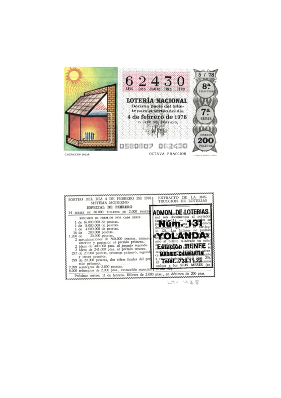 Décimo "Especial de Febreiro" da Lotaría Nacional de 1978 co motivo "Os Recursos naturais": imaxe da representación da calefacción solar. O número do décimo é o 62430 / ANVERSO. Impresión / 62430 / Lotería Nacional. Décima parte del billete para el sorteo del día 4 de febrero de 1978 / El jefe del servicio (sinatura) / 0580807 - 062430 / 5/78 / 8ª fracción / 7ª serie / Precio 200 pesetas / Calefacción solar (imaxe) / Octava fracción / Fca. Nal. de Moneda y Timbre / REVERSO. impresión / Sorteo del día 4 de febrero de 1978. Sistema moderno. Especial de febrero. 14 series de 80.000 billetes de 2.000 pesetas. (Resumo de premios) / Extracto de la instrucción de Loterías (texto) / Próximo sorteo: 11 de febrero. Billetes de 2.000 ptas., en décimos de 200 ptas