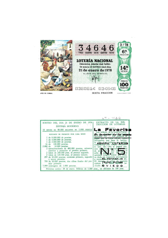 Décimo da Lotaría Nacional de 1978 co motivo "Os Recursos naturais": imaxe que representa unhas aves de corral. O número do décimo é o 34646 / ANVERSO. Impresión / 34646 / Lotería Nacional. Décima parte del billete para el sorteo del día 21 de enero de 1978 / El jefe del servicio (sinatura) / 0380614 - 034646 / 3/78 / 6ª fracción / 14ª serie / Precio 100 pesetas / Aves de corral (imaxe) / Sexta fracción / Fca. Nal. de Moneda y Timbre / REVERSO. Impresión / Sorteo del día 21 de enero de 1978. Sistema moderno. 18 series de 80.000 billetes de 1.000 pesetas. (Resumo de premios) / Extracto de la instrucción de Loterías (texto) / Próximo sorteo: 28 de enero. Billetes de 1.000 ptas., en décimos de 100 ptas