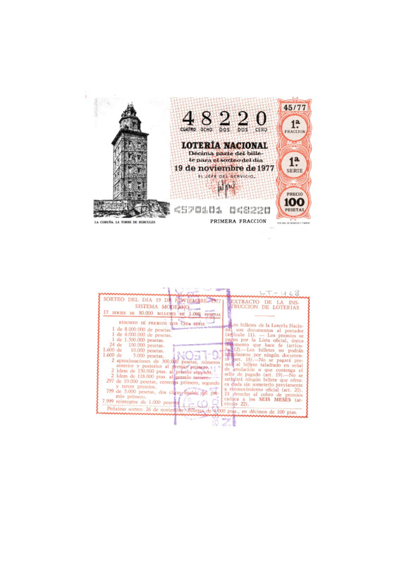 Décimo da Lotaría Nacional de 1977 co motivo "As provincias españolas": imaxe que representa a Torre de Hércules, en A Coruña. O número do décimo é o 48220 / ANVERSO. Impresión / 48220 / Lotería Nacional. Décima parte del billete para el sorteo del día 19 de noviembre de 1977 / El jefe del servicio (sinatura) / 4570101 - 048220 / 45/77 / 1ª fracción / 1ª serie / Precio 100 pesetas / La Coruña. La Torre de Hércules (imaxe) / Primera fracción / Fca. Nal. de Moneda y Timbre / REVERSO. Impresión / Sorteo del día 19 de noviembre 1977. Sistema moderno. 17 series de 80.000 billetes de 1.000 pesetas. (Resumo de premios) / Extracto de la instrucción de Loterías (texto) / Próximo sorteo: 26 de noviembre. Billetes de 1.000 ptas., en décimos de 100 ptas