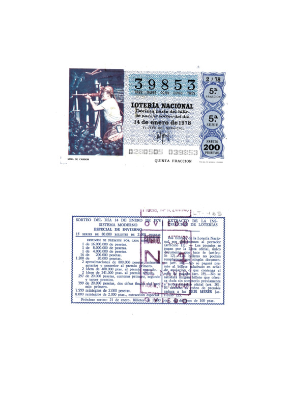 Décimo "Especial de Inverno" da Lotaría Nacional de 1978 co motivo "Os Recursos naturais": imaxe que representa o traballo nunha mina de carbón. O número do décimo é o 39853 / ANVERSO. Impresión / 39853 / Lotería Nacional. Décima parte del billete para el sorteo del día 14 de enero de 1978 / El jefe del servicio (sinatura) / 0280505 - 039853 / 2/78 / 5ª fracción / 5ª serie / Precio 200 pesetas / Mina de carbón (imaxe) / Quinta fracción / Fca. Nal. de Moneda y Timbre / REVERSO. Impresión / Sorteo del día 14 de enero de 1978. Sistema moderno. Especial de invierno. 15 series de 80.000 billetes de 2.000 pesetas. (Resumo de premios) / Extracto de la instrucción de Loterías (texto) / Próximo sorteo: 21 de enero. Billetes de 1.000 ptas., en décimos de 100 ptas