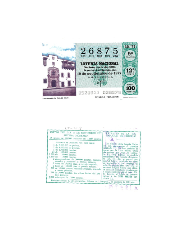 Décimo da Lotaría Nacional de 1977 co motivo "As provincias españolas": imaxe que representa a Casa de Colón nas Palmas de Gran Canaria. O número do décimo é o 26875 / ANVERSO. Impresión / 26875 / Lotería Nacional. Décima parte del billete para el sorteo del día 10 de septiembre de 1977 / El jefe del servicio (sinatura) / 3570912 - 026875 / 35/77 / 9ª fracción / 12ª serie / Precio 100 pesetas / Gran Canaria. La Casa de Colón (imaxe) / Novena fracción / Fca. Nal. de Moneda y Timbre / REVERSO. Impresión / Sorteo del día 10 de septiembre 1977. Sistema moderno. 17 series de 80.000 billetes de 1.000 ptesetas. (Resumo de premios) / Extracto de la instrucción de Loterías (texto) / Próximo sorteo: 17 de septiembre. Billetes de 1.000 ptas., en décimos de 100 ptas