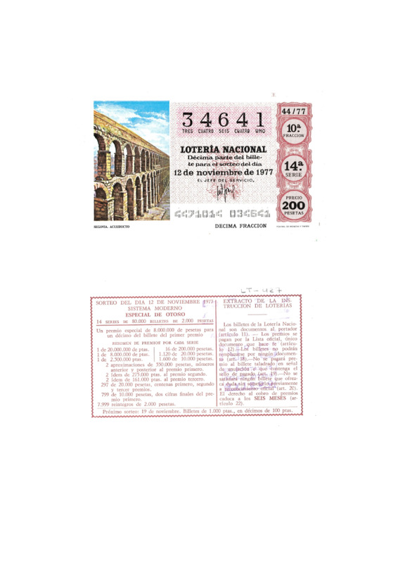 Décimo "Especial de Outono" da Lotaría Nacional de 1977 co motivo "As provincias españolas": imaxe que representa o Acueduto de Segovia. O número do décimo é o 34641 / ANVERSO. Impresión / 34641 / Lotería Nacional. Décima parte del billete para el sorteo del día 12 de noviembre de 1977 / El jefe del servicio (sinatura) / 4471014 - 034641 / 44/77 / 10ª fracción / 14ª serie / Precio 200 pesetas / Segovia. Acueducto (imaxe) / Décima fracción / Fca. Nal. de Moneda y Timbre / REVERSO. Impresión / Sorteo del día 12 de noviembre 1977. Sistema moderno. Especial de Otoño. 14 series de 80.000 billetes de 2.000 pesetas. (Resumo de premios) / Extracto de la instrucción de Loterías (texto) / Próximo sorteo: 19 de noviembre. Billetes de 1.000 ptas., en décimos de 100 ptas