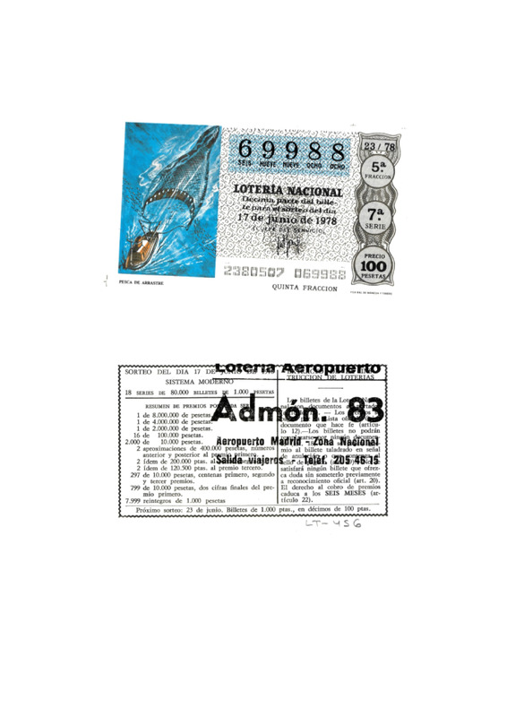 Décimo da Lotaría Nacional de 1978 co motivo "Os Recursos naturais": imaxe que representa a pesca de arrastre. O número do décimo é o 69988 / ANVERSO. Impresión / 69988 / Lotería Nacional. Décima parte del billete para el sorteo del día 17 de junio de 1978 / El jefe del servicio (sinatura) / 2380507 - 069988 / 23/78 / 5ª fracción / 7ª serie / Precio 100 pesetas / Pesca de arrastre (imaxe) / Quinta fracción / Fca. Nal. de Moneda y Timbre / REVERSO. Impresión / Sorteo del día 17 de junio de 1978. Sistema moderno. 18 series de 80.000 billetes de 1.000 pesetas. (Resumo de premios) / Extracto de la instrucción de Loterías (imaxe) / Próximo sorteo: 23 de junio. Billetes de 1.000 ptas., en décimos de 100 ptas
