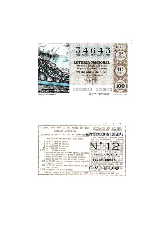 Décimo da Lotaría Nacional de 1978 co motivo "Os Recursos naturais": imaxe que representa unha corrente subterránea. O número do décimo é o 34643 / ANVERSO. Impresión / 34643 / Lotería Nacional. Décima parte del billete para el sorteo del día 29 de abril de 1978 / El jefe del servicio (sinatura) / 1680611 - 034643 / 16/78 / 6ª fracción / 11ª serie / Precio 100 pesetas / Corriente subterránea (imaxe) / Sexta fracción / Fca. Nal. de Moneda y Timbre / REVERSO. Impresión / Sorteo del día 29 de abril de 1978. Sistema moderno. 18 series de 80.000 billetes de 1.000 pesetas. (Resumo de premios) / Extracto de la instrucción de Loterías (texto) / Próximo sorteo: 6 de mayo. Billetes de 2.000 ptas., en décimos de 200 ptas