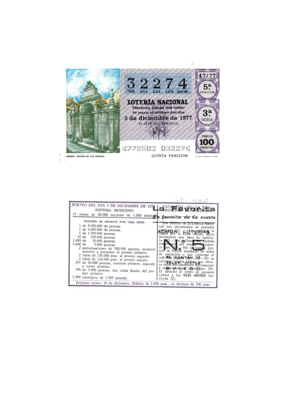 Décimo da Lotaría Nacional de 1977 co motivo "As provincias españolas": imaxe que representa a Fonte das Burgas, en Ourense. O número do décimo é o 32274 / ANVERSO. Impresión / 32274 / Lotería Nacional. Décima parte del billete para el sorteo del día 3 de diciembre de 1977 / El jefe del servicio (sinatura) / 4770503 - 032274 / 47/77 / 5ª fracción / 3ª serie / Precio 100 pesetas / Orense. Fuente de las Burgas (imaxe) / Quinta fracción / Fca. Nal. de Moneda y Timbre / REVERSO. Impresión / Sorteo del día 3 de diciembre de 1977. Sistema moderno. 17 series de 80.000 billetes de 1.000 pesetas. (Resumo de premios (texto) / Próximo sorteo: 10 de diciembre. Billetes de 1.000 ptas., en décimos de 100 ptas
