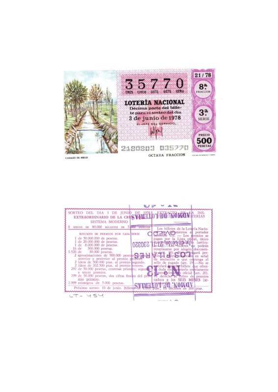 Décimo "Extraordinario da Cruz Vermella" da Lotaría Nacional de 1978 co motivo "Os Recursos naturais": imaxe que representa unha canle de rego. O número do décimo é o 35770 / ANVERSO. Impresión / 35770 / Lotería Nacional. Décima parte del billete para el sorteo del día 3 de junio de 1978 / El jefe del servicio (sinatura) / 2180803 - 035770 / 21/78 / 8ª fracción / 3ª serie / Precio 500 pesetas / Canales de riego (imaxe) / Octava fracción / Fca. Nal. de Moneda y Timbre / REVERSO. Impresión / Sorteo del día 3 de junio de 1978. Extraordinario de la Cruz Roja. Sistema moderno. 8 series de 80.000 billetes de 5.000 pesetas. (Resumo de premios) / Extracto de la instrucción de Loterías (texto) / Próximo sorteo: 10 de junio. Billetes de 2.000 ptas., en décimos de 200 ptas
