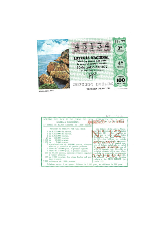 Décimo da Lotaría Nacional de 1977 co motivo "As provincias españolas": imaxe que representa a Costa Brava, en Xirona. O número do décimo é o 41134 / ANVERSO. Impresión / 43134 / Lotería Nacional. Décima parte del billete para el sorteo del día 30 de julio de 1977 / El jefe del servicio (sinatura) / 2970304 - 043134 / 29/77 / 3ª fracción / 4ª serie / Precio 100 pesetas / Gerona. Costa Brava (imaxe) / Tercera fracción / Fca. Nal. de Moneda y Timbre / REVERSO. Impresión / Sorteo del día 30 de julio de 1977. Sistema moderno. 17 series de 80.000 billetes de 1.000 pesetas. (Resumo de premios) / Extracto de la instrucción de Loterías (texto) / Próximo sorteo: 6 de agosto. Billetes de 2.000 ptas., en décimos de 200 ptas