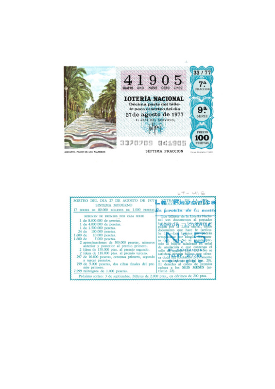 Décimo da Lotaría Nacional de 1977 co motivo "As provincias españolas": imaxe que representa o Paseo das Palmeiras, en Alacante. O número do décimo é o 41905 / ANVERSO. Impresión / 41905 / Lotería Nacional. Décima parte del billete para el sorteo del día 27 de agosto de 1977 / El jefe del servicio (sinatura) / 3370709 - 041905 / 33/77 / 7ª fracción / 9ª serie / Precio 100 pesetas / Alicante. Paseo de las Palmeras (imaxe) / Séptima fracción / Fca. Nal. de Moneda y Timbre / REVERSO. Impresión / Sorteo del día 27 de agosto de 1977. Sistema moderno. 17 series de 80.000 billetes de 1.000 pesetas. (Resumo de premios) / Extracto de la instrucción de Loterías (texto) / Próximo sorteo: 3 de septiembre. Billetes de 2.000 ptas., en décimos de 200 ptas