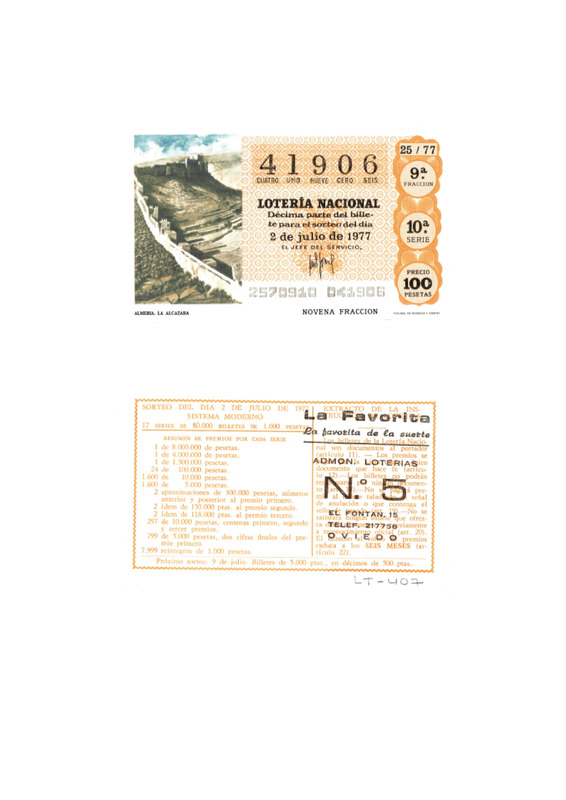 Décimo da Lotaría Nacional de 1977 co motivo "As provincias españolas": imaxe que representa A Alcazaba de Almería. O número do décimo é o 41906 / ANVERSO. Impresión / 41906 / Lotería Nacional. Décima parte del billete para el sorteo del día 2 de julio de 1977 / El jefe del servicio (sinatura) / 2570910 - 041906 / 25/77 / 9ª fracción / 10ª serie / Precio 100 pesetas / Almería. La Alcazaba (imaxe) / Novena fracción / Fca. Nal. de Moneda y Timbre / REVERSO. Impresión / Sorteo del día 2 de julio de 1977. Sistema moderno. 17 series de 80.000 billetes de 1.000 pesetas. (Resumo de premios) / Extracto de la instrucción de Loterías (texto) / Próximo sorteo: 9 de julio. Billetes de 5.000 ptas., en décimos de 500 ptas