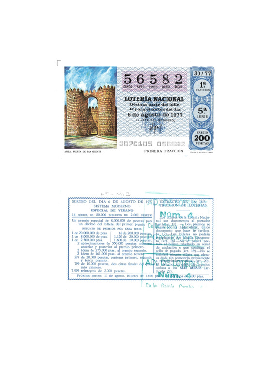 Décimo "Especial de Verán" da Lotaría Nacional de 1977 co motivo "As provincias españolas": imaxe que representa a Porta de San Vicente de Ávila. O número do décimo é o 56582 / ANVERSO. Impresión / 56582 / Lotería Nacional. Décima parte del billete para el sorteo del día 6 de agosto de 1977 / El jefe del servicio (sinatura) / 3070105 - 056582 / 30/77 / 1ª fracción / 5ª serie / Precio 200 pesetas / Ávila. Puerta de San Vicente (imaxe) / Primera fracción / Fca. Nal. de Moneda y Timbre / REVERSO. Impresión / Sorteo del día 6 de agosto de 1977. Sistema moderno. Especial de verano. 14 series de 80.000 billetes de 2.000 pesetas. (Resumo de premios) / Extracto de la instrucción de Loterías (texto) / Próximo sorteo: 13 de agosto. Billetes de 1.000 ptas., en décimos de 100 ptas