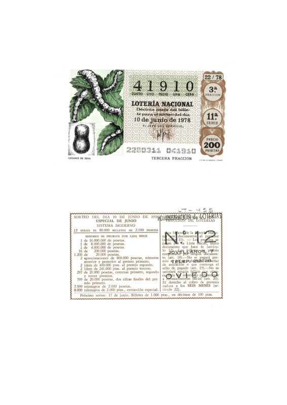 Décimo "Especial de Xuño" da Lotaría Nacional de 1978 co motivo "Os Recursos naturais": imaxe que representa vermes de seda. O número do décimo é o 41910 / ANVERSO. Impresión / 41910 / Lotería Nacional. Décima parte del billete para el sorteo del día 10 de junio de 1978 / El jefe del servicio (sinatura) / 2280311 - 041910 / 22/78 / 3ª fracción / 11ª serie / Precio 200 pesetas / Gusanos de seda (imaxe) / Tercera fracción / Fca. Nal. de Moneda y Timbre / REVERSO. Impresión / Sorteo del día 10 de junio de 1978. Especial de junio. Sistema moderno. 15 series de 80.000 billetes de 2.000 pesetas. (Resumo de premios) / Extracto de la instrucción de Loterías (texto) / Próximo sorteo: 17 de junio. Billetes de 1.000 ptas., en décimos de 100 ptas