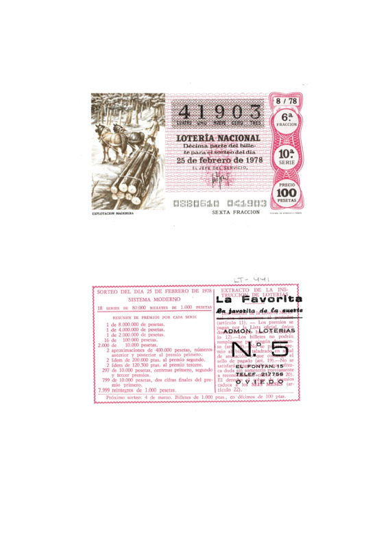 Décimo da Lotaría Nacional de 1978 co motivo "Os Recursos naturais": imaxe que representa unha explotación madereira. O número do décimo é o 41903 / ANVERSO. Impresión / 41903 / Lotería Nacional. Décima parte del billete para el sorteo del día 25 de febrero de 1978 / El jefe del servicio (sinatura) / 0880610 - 041903 / 8/78 / 6ª fracción / 10ª serie / Precio 100 pesetas / Explotación maderera (imaxe) / Sexta fracción / Fca. Nal. de Moneda y Timbre / REVERSO. Impresión / Sorteo del día 25 de febrero de 1978. Sistema moderno. 18 series de 80.000 billetes de 1.000 pesetas. (Resumo de premios) / Extracto de la instrucción de Loterías (texto) / Próximo sorteo: 4 de marzo. Billetes de 1.000 ptas., en décimos de 100 ptas