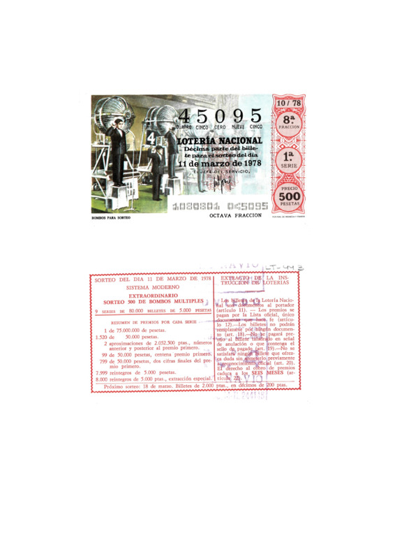 Décimo "Extraordinario Sorteo 500 de Bombos Múltiples" da Lotaría Nacional de 1978 co motivo "Os Recursos naturais": imaxe que representa os bombos para o sorteo. O número do décimo é o 45095 / ANVERSO. Impresión / 45095 / Lotería Nacional. Décima parte del billete para el sorteo del día 11 de marzo de 1978 / El jefe del servicio (sinatura) / 1080801 - 045095 / 10/78 / 8ª fracción / 1ª serie / Precio 500 pesetas / Bombos para sorteo (imaxe) / Octava fracción / Fca. Nal. de Moneda y Timbre / REVERSO. Impresión / Sorteo del día 11 de marzo de 1978. Sistema moderno. Extraordinario Sorteo 500 de bombos múltiples. 9 series de 80.000 billetes de 5.000 pesetas. (Resumo de premios) / Extracto de la instrucción de Loterías (texto) / Próximo sorteo: 18 de marzo. Billetes de 2.000 ptas., en décimos de 200 ptas