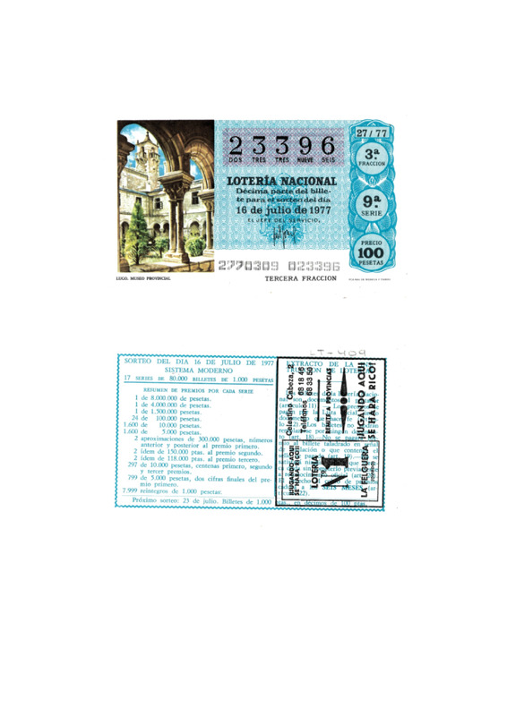 Décimo da Lotaría Nacional de 1977 co motivo "As provincias españolas": imaxe que representa o claustro do Museo Provincial de Lugo. O número do décimo é o 34650 / ANVERSO. Impresión / 34650 / Lotería Nacional. Décima parte del billete para el sorteo del día 16 de julio de 1977 / El jefe del servicio (sinatura) / 27/77 / 10ª fracción / 1ª serie / Precio 100 pesetas / Lugo. Museo Provincial (imaxe) / Fca. Nal. de Moneda y Timbre / REVERSO. Impresión / Sorteo del día 16 de julio de 1977. Sistema moderno. 17 series de 80.000 billetes de 1.000 pesetas. (Resumo de premios) / Extracto de la instrucción de Loterías (texto) / Próximo sorteo: 23 de julio. Billetes de 1.000 ptas., en décimos de 100 ptas