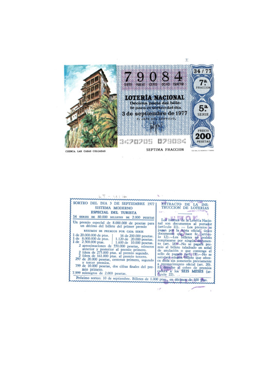 Décimo "Especial do Turista" da Lotaría Nacional de 1977 co motivo "As provincias españolas": imaxe que representa as Casas Colgadas de Cuenca. O número do décimo é o 79084 / ANVERSO. Impresión / 79084 / Lotería Nacional. Décima parte del billete para el sorteo del día 3 de septiembre de 1977 / El jefe del servicio (sinatura) / 3470705 - 079084 / 34/77 / 7ª fracción / 5ª serie / Precio 200 pesetas / Cuenca. Las Casas Colgadas (imaxe) / Séptima fracción / Fca. Nal. de Moneda y Timbre / REVERSO. Impresión / Sorteo del día 3 de septiembre 1977. Sistema moderno. Especial del turista. 14 series de 80.000 billetes de 2.000 pesetas. (Resumo de premios) / Extracto de la instrucción de Loterías (texto) / Próximo sorteo: 10 de septiembre. Billetes de 1.000 ptas., en décimos de 100 ptas