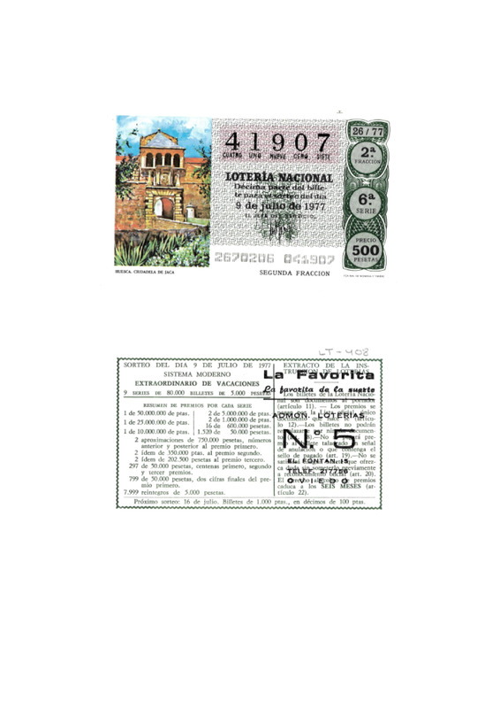 Décimo "Extraordinario de Vacacións" da Lotaría Nacional de 1977 co motivo "As provincias españolas": imaxe que representa a Cidadela de Jaca, en Huesca. O número do décimo é o 41907 / ANVERSO. Impresión / 41907 / Lotería Nacional. Décima parte del billete para el sorteo del día 9 de julio de 1977 / El jefe del servicio (sinatura) / 2670205 - 041907 / 26/77 / 2ª fracción / 6ª serie / Precio 500 pesetas / Huesca. Ciudadela de Jaca (imaxe) / Segunda fracción / Fca. Nal. de Moneda y Timbre / REVERSO. Impresión / Sorteo del día 9 de julio de 1977. Sistema moderno. Extraordinario de vacaciones. 9 series de 80.000 billetes de 5.000 pesetas. (Resumo de premios) / Extracto de la instrucción de Loterías (texto) / Próximo sorteo: 16 de julio. Billetes de 1.000 ptas., en décimos de 100 ptas
