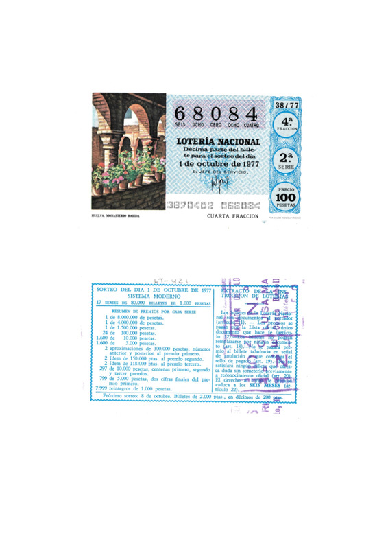 Décimo da Lotaría Nacional de 1977 co motivo "As provincias españolas": imaxe que representa o Mosteiro da Rábida, en Huelva. O número do décimo é o 68084 / ANVERSO. Impresión / 68084 / Lotería Nacional. Décima parte del billete para el sorteo del día 1 de octubre de 1977 / El jefe del servicio (sinatura) / 3870402 - 068084 / 38/77 / 4ª fracción / 2ª serie / Precio 100 pesetas / Huelva. Monasterio Rábida (imaxe) / Cuarta fracción / Fca. Nal. de Moneda y Timbre / REVERSO. Impresión / Sorteo del día 1 de octubre de 1977. Sistema moderno. 17 series de 80.000 billetes de 1.000 pesetas. (Resumo de premios) / Extracto de la instrucción de Loterías (texto) / Próximo sorteo: 8 de octubre. Billetes de 2.000 ptas., en décimos de 200 ptas