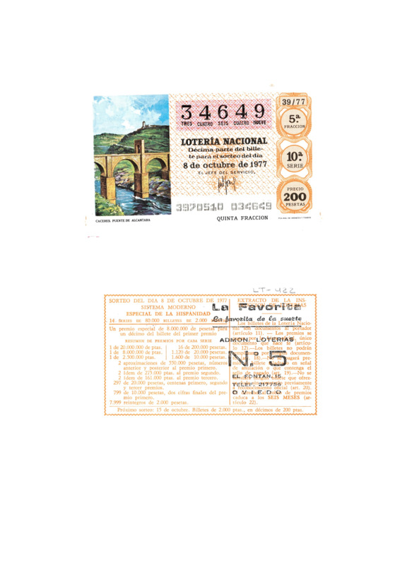 Décimo "Especial da Hispanidade" da Lotaría Nacional de 1977 co motivo "As provincias españolas": imaxe que representa a Ponte de Alcántara, en Cáceres. O número do décimo é o 34649 / ANVERSO. Impresión / 34649 / Lotería Nacional. Décima parte del billete para el sorteo del día 8 de octubre de 1977 / El jefe del servicio (sinatura) / 3970510 - 034649 / 39/77 / 5ª fracción / 10ª serie / Precio 200 pesetas / Cáceres. Puente de Alcántara (imaxe) / Quinta fracción / Fca. Nal. de Moneda y Timbre / REVERSO. Impresión / Sorteo del día 8 de octubre de 1977. Sistema moderno. Especial de la Hispanidad. 14 series de 80.000 billetes de 2.000 pesetas. (Resumo de premios) / Extracto de la instrucción de Loterías (texto) / Próximo sorteo: 15 de octubre. Billetes de 2.000 ptas., en décimos de 200 ptas