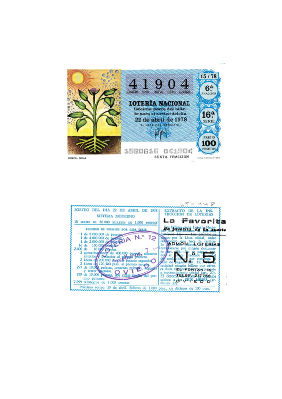 Décimo da Lotaría Nacional de 1978 co motivo "Os Recursos naturais": imaxe que representa a enerxía solar. O número do décimo é o 41904 / ANVERSO. Impresión / 41904 / Lotería Nacional. Décima parte del billete para el sorteo del día 22 de abril de 1978 / El jefe del servicio (sinatura) / 1580616 - 041904 / 15/78 / 6ª fracción / 16ª serie / Precio 100 pesetas / Energía solar (imaxe) / Sexta fracción / Fca. Nal. de Moneda y Timbre / REVERSO. Impresión / Sorteo del día 22 de abril de 1978. Sistema moderno. 18 series de 80.000 billetes de 1.000 pesetas. (Resumo de premios) / Extracto de la instrucción de Loterías (texto) / Próximo sorteo: 29 de abril. Billetes de 1.000 ptas., en décimos de 100 ptas