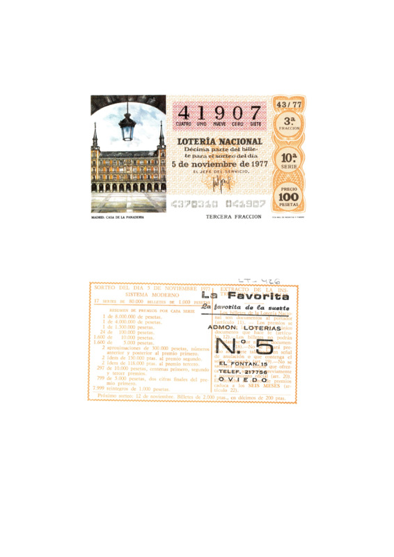 Décimo da Lotaría Nacional de 1977 co motivo "As provincias españolas": imaxe que representa a Casa da Panadería, en Madrid. O número do décimo é o 41907 / ANVERSO. Impresión / 41907 / Lotería Nacional. Décima parte del billete para el sorteo del día 5 de noviembre de 1977 / El jefe del servicio (sinatura) / 4370310 - 041907 / 43/77 / 3ª fracción / 10ª serie / Precio 100 pesetas / Madrid. Casa de la Panadería (imaxe) / Tercera fracción / Fca. Nal. de Moneda y Timbre / REVERSO. Impresión / Sorteo del día 5 de noviembre 1977. Sistema moderno. 17 series de 80.000 billetes de 1.000 pesetas. (Resumo de premios) / Extracto de la instrucción de Loterías (texto) / Próximo sorteo: 12 de noviembre. Billetes de 2.000 ptas., en décimos de 200 ptas