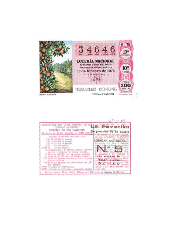 Décimo "Especial de San Valentín" da Lotaría Nacional de 1978 co motivo "Os Recursos naturais": imaxe que representa un cultivo de cítricos. O número do décimo é o 34646 / ANVERSO. Impresión / 34646 / Lotería Nacional. Décima parte del billete para el sorteo del día 11d e febrero de 1978 / El jefe del servicio (sinatura) / 0681010 - 034646 / 6/78 / 10ª fracción / 10ª serie / Precio 200 pesetas / Cultivo de cítricos (imaxe) / Décima fracción / Fca. Nal. de Moneda y Timbre / REVERSO. Impresión / Sorteo del día 11 de febrero de 1978. Sistema moderno. Especial de San Valentín. 14 series de 80.000 billetes de 2.000 pesetas. (Resumo de premios) / Extracto de la instrucción de Loterías (texto) / Próximo sorteo: 18 de febrero. Billetes de 1.000 ptas., en décimos de 100 ptas