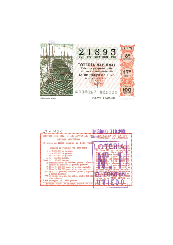 Décimo da Lotaría Nacional de 1978 co motivo "Os Recursos naturais": imaxe que representa un criadeiro de algas. O número do décimo é o 21893 / ANVERSO. Impresión / 21893 / Lotería Nacional. Décima parte del billete para el sorteo del día 13 de mayo de 1978 / El jefe del servicio (sinatura) / 1880817 - 021893 / 18/78 / 8ª fracción / 17ª serie / Precio 100 pesetas / Criadero de algas (imaxe) / Octava fracción / Fca. Nal. de Moneda y Timbre / REVERSO. Impresión / Sorteo del día 13 de mayo de 1978. Sistema moderno. 18 series de 80.000 billetes de 1.000 pesetas. (Resumo de premios) / Extracto de la instrucción de Loterías (texto) / Próximo sorteo: 20 de mayo. Billetes de 2.000 ptas., en décimos de 200 ptas