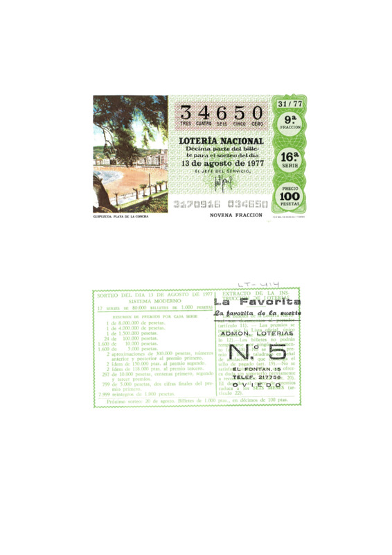 Décimo da Lotaría Nacional de 1977 co motivo "As provincias españolas": imaxe que representa a Praia da Concha de San Sebastián, Guipúscoa. O número do décimo é o 34650 / ANVERSO. Impresión / 34650 / Lotería Nacional. Décima parte del billete para el sorteo del día 13 de agosto de 1977 / El jefe del servicio (sinatura) / 3170916 - 034650 / 31/77 / 9ª fracción / 16ª serie / Precio 100 pesetas / Gupúzcoa. Playa de la Concha (imaxe) / Novena fracción / Fca. Nal. de Moneda y Timbre / REVERSO. Impresión / Sorteo del día 13 de agosto de 1977. Sistema moderno. 17 series de 80.000 billetes de 1.000 pesetas. (Resumo de premios) / Extracto de la instrucción de Loterías (texto) / Próximo sorteo: 20 de agosto. Billetes de 1.000 ptas., en décimos de 100 ptas