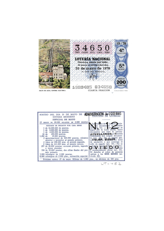 Décimo "Especial de Maio" da Lotaría Nacional de 1978 co motivo "Os Recursos naturais": imaxe que representa un salto de auga dunha central hidroeléctrica. O número do décimo é o 21893 / ANVERSO. Impresión / 34650 / Lotería Nacional. Décima parte del billete para el sorteo del día 20 de mayo de 1978 / El jefe del servicio (sinatura) / 1980405 - 034650 / 19/78 / 4ª fracción / 5ª serie / Precio 200 pesetas / salto de agua, central hidroeléctrica (imaxe) / Cuarta fracción / Fca. Nal. de Moneda y Timbre / REVERSO. Impresión / Sorteo del día 20 de mayo de 1978. Sistema moderno. Especial de mayo. 15 series de 80.000 billetes de 2.000 pesetas. (Resumo de premios) / Extracto de la instrucción de Loterías (texto) / Próximo sorteo: 27 de mayo. Billetes de 1.000 ptas., en décimos de 100 ptas
