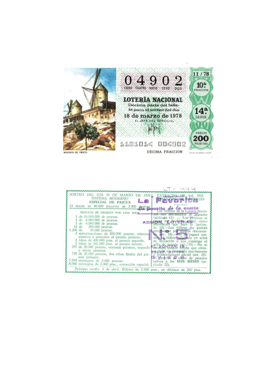 Décimo "Especial de Pascua" da Lotaría Nacional de 1978 co motivo "Os Recursos naturais": imaxe que representa muíños de vento. O número do décimo é o 04902 / ANVERSO. Impresión / 04902 / Lotería Nacional. Décima parte del billete para el sorteo del día 18 de marzo de 1978 / El jefe del servicio (sinatura) / 1181014 - 004902 / 11/78 / 10ª fracción / 14ª serie / Precio 200 pesetas / Molinos de viento (imaxe) / Décima fracción / Fca. Nal. de Moneda y Timbre / REVERSO. Impresión / Sorteo del día 18 de marzo de 1978. Sistema moderno. Especial de Pascua. 15 series de 80.000 billetes de 2.000 pesetas. (Resumo de premios) / Extracto de la instrucción de de Loterías (texto) / Próximo sorteo: 1 de abril. Billetes de 2.000 ptas., en décimos de 200 ptas
