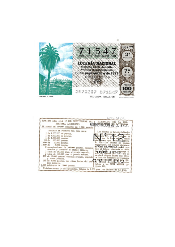 Décimo da Lotaría Nacional de 1977 co motivo "As provincias españolas": imaxe que representa o Teide, en Tenerife. O número do décimo é o 71547 / ANVERSO. Impresión / 71547 / Lotería Nacional. Décima parte del billete para el sorteo del día 17 de septiembre de 1977 / El jefe del servicio (sinatura) / 3670207 - 071547 / 36/77 / 2ª fracción / 7ª serie / Precio 100 pesetas / Tenerife. El Teide (imaxe) / Segunda fracción / Fca. Nal. de Moneda y Timbre / REVERSO. Impresión / Sorteo del día 17 de septiembre 1977. Sistema moderno. 17 series de 80.000 billetes de 1.000 pesetas. (Resumo de premios) / Extracto de la instrucción de Loterías (texto) / Próximo sorteo: 24 de septiembre. Billetes de 1.000 ptas., en décimos de 100 ptas