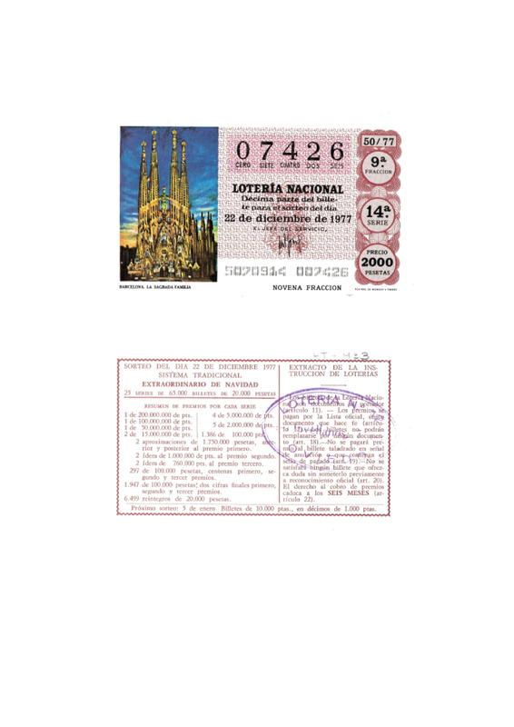 Décimo "Extraordinario de Nadal" da Lotaría Nacional de 1977 co motivo "As provincias españolas": imaxe que representa a Sagrada Familia de Barcelona. O número do décimo é o 07426 / ANVERSO. Impresión / 07426 / Lotería Nacional. Décima parte del billete para el sorteo del día 22 de diciembre de 1977 / El jefe del servicio (sinatura) / 5070914 - 007426 / 50/77 / 9ª fracción / 17ª serie / Precio 2.000 pesetas / Barcelona. La Sagrada Familia (imaxe) / Novena fracción / Fca. Nal. de Moneda y Timbre / REVERSO. Impresión / Sorteo del día 22 de diciembre 1977. Sistema tradicional. Extraordinario de Navidad. 25 series de 65.000 billetes de 20.000 pesetas. (Resumo de premios) / Extracto de la instrucción de Loterías (texto) / Próximo sorteo: 5 de enero. Billetes de 10.000 ptas., en décimos de 1.000 ptas