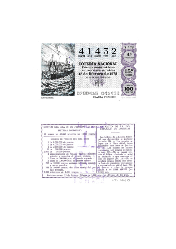 Décimo da Lotaría Nacional de 1978 co motivo "Os Recursos naturais": imaxe que representa un barco factoría. O número do décimo é o 41432 / ANVERSO. Impresión / 41432 / Lotería Nacional. Décima parte del billete para el sorteo del día 18 de febrero de 1978 / El jefe del servicio (sinatura) / 0780415 - 041432 / 7/78 / 4ª fracción / 15ª serie / Precio 100 pesetas / Barco factoría (imaxe) / Cuarta fracción / Fca. Nal. de Moneda y Timbre / REVERSO. Impresión / Sorteo del día 18 de febrero de 1978. Sistema moderno. 18 series de 80.000 billetes de 1.000 pesetas. (Resumo de premios) / Extracto de la instrucción de Loterías (texto) / Próximo sorteo: 25 de febrero. Billetes de 1.000 ptas., en décimos de 100 ptas