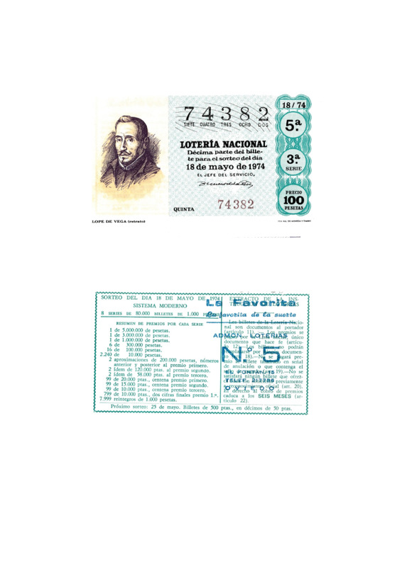 Décimo da Lotaría Nacional de 1974 co motivo "O libro": imaxe que representa un retrato de Lope de Vega. O número do décimo é o 74382 / ANVERSO. Impresión / 74382 / Lotería Nacional. Décima parte del billete para el sorteo del día 18 de mayo de 1974 / El jefe del servicio (sinatura) / Quinta / 74382 / 18/74 / 5ª / 3ª serie / Precio 100 pesetas / Lope de Vega (retrato) (imaxe) / Fca. Nal. de Moneda y Timbre / REVERSO. Impresión / Sorteo del día 18 de mayo de 1974. Sistema moderno. 8 series de 80.000 billetes de 1.000 ptas. (Resumo de premios) / Extracto de la instrucción de Loterías (texto) / Próximo sorteo: 25 de mayo. Billetes de 500 ptas., en décimos de 50 ptas