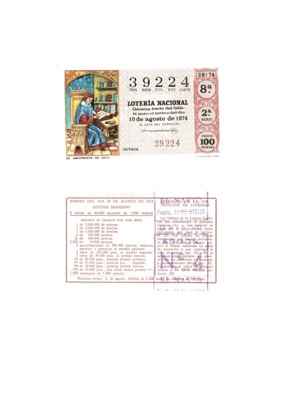 Décimo da Lotaría Nacional de 1974 co motivo "O libro": imaxe que representa ao Arcipreste de Hita. O número do décimo é o 39224 / ANVERSO. Impresión / 39224 / Lotería Nacional. Décima parte del billete para el sorteo del día 10 de agosto de 1974 / El jefe del servicio (sinatura) / Octava / 39224 / 28/74 / 8ª / 2ª serie / Precio 100 pesetas / El Arcipreste de Hita (imaxe) / Fca. Nal. de Moneda y Timbre / REVERSO. Impresión / Sorteo del día 10 de agosto de 1974. Sistema moderno. 8 series de 80.000 billetes de 1.000 pesetas. (Resumo de premios) / Extracto de la instrucción de Loterías (texto) / Próximo sorteo: 17 de agosto. Billetes de 1.000 ptas., en décimos de 100 ptas