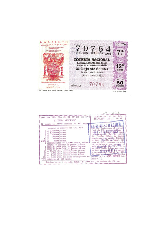 Décimo da Lotaría Nacional de 1974 co motivo "O libro": imaxe que representa a portada das "Sete Partidas". O número do décimo é o 70764 / ANVERSO. Impresión / 70764 / Lotería Nacional. Décima parte del billete para el sorteo del día 22 de junio de 1974 / El jefe del servicio (sinatura) / Séptima / 70764 / 23/74 / 7ª / 12ª serie / Precio 50 pesetas / Portada de las Siete Partidas (imaxe) / Fca. Nal. de Moneda y Timbre / REVERSO. Impresión / Sorteo del día 22 de junio de 1974. Sistema moderno. 12 series de 80.000 billetes de 500 pesetas. (Resumo de premios) / Extracto de la instrucción de Loterías (texto) / Próximo sorteo: 6 de julio. Billetes de 1.000 ptas., en décimos de 100 ptas