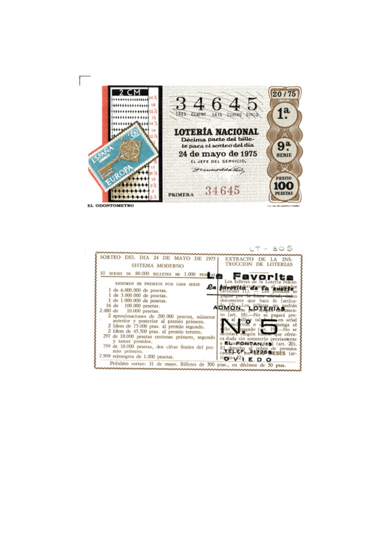Décimo da Lotaría Nacional de 1975 co motivo "A filatelia": imaxe que representa un "odontómetro" (dispositivo utilizado para medir o dentado dos selos postais). O número do décimo é o 34645 / ANVERSO. Impresión / 34645 / Lotería Nacional. Décima parte del billete para el sorteo del día 24 de mayo de 1975 / El jefe del servicio (sinatura) / Primera / 34645 / 20/75 /1ª / 9ª serie / Precio 100 pesetas / El odontómetro (imaxe) / Fca. Nal. de Moneda y Timbre / REVERSO. Impresión / Sorteo del día 24 de mayo de 1975. Sistema moderno. 10 series de 80.000 billetes de 1.000 pesetas. (Resumo de premios) / Extracto de la instrucción de Loterías (texto) / Próximo sorteo: 31 de mayo. Billetes de 500 ptas., en décimos a 50 ptas