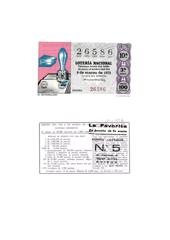 Décimo da Lotaría Nacional de 1975 co motivo "A filatelia": imaxe que representa o procedemento do "matasellado". O número do décimo é o 26586 / ANVERSO. Impresión / 26586 / Lotería Nacional. Décima parte del billete para el sorteo del día 8 de marzo de 1975 / El jefe del servicio (sinatura) / Décima / 26586 / 10/75 / 10ª / 3ª serie / Precio 100 pesetas / El marasellado (imaxe) / Fca. Nal. de Moneda y Timbre / REVERSO. Impresión / Sorteo del día 8 de marzo de 1975. Sistema moderno. 10 series de 80.000 billetes de 1.000 pesetas. (Resumo de premios) / Extracto de la instrucción de Loterías (texto) / Próximo sorteo: 15 de marzo. Billetes de 2.000 ptas., en décimos de 200 ptas