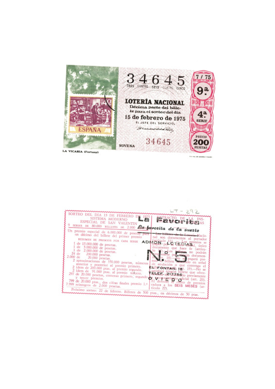 Décimo "Especial de San Valentín" da Lotaría Nacional de 1975 co motivo "A filatelia": representación dun selo coa imaxe do cadro de Mariano Fortuny "La vicaría". O número do décimo é o 34645 / ANVERSO. Impresión / 34645 / Lotería Nacional. Décima parte del billete para el sorteo del día 15 de febrero de 1975 / El jefe del servicio (sinatura) / Novena / 34645 / 7/75 / 9ª / 4ª serie / Precio 200 pesetas / La vicaría (Fortuny) (imaxe) / Fca. Nal. de Moneda y Timbre / REVERSO. Impresión / Sorteo del día 15 de febrero de 1975. Sistema moderno. Especial de San Valentín. 9 series de 80.000 billetes de 2.000 pesetas. (Resumo de premios) / Extracto de la instrucción de Loterías (texto) / Próximo sorteo: 22 de febrero. Billetes de 500 ptas., en décimos de 50 ptas