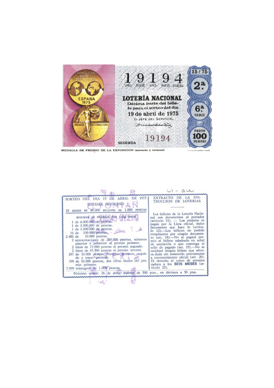 Décimo da Lotaría Nacional de 1975 co motivo "A filatelia": imaxe que representa anverso e reverso dunha medalla do premio da Exposición Mundial de Filatelia de 1975. O número do décimo é o 19194 / ANVERSO. Impresión / 19194 / Lotería Nacional. Décima parte del billete para el sorteo del día 19 de abril de 1975 / El jefe del servicio (sinatura) / Segunda / 19194 / 15/75 / 2ª / 6ª serie / Precio 100 pesetas / Medalla de premio de la Exposición (anverso y reverso) / Fca. Nal. de Moneda y Timbre / REVERSO. Impresión / Sorteo del día 19 de abril de 1976. Sistema moderno. 10 series de 80.000 billetes de 1.000 pesetas. (Resumo de premios) / Extracto de la instrucción de Loterías (texto) / Próximo sorteo: 26 de abril. Billetes de 500 ptas., en décimos a 50 ptas