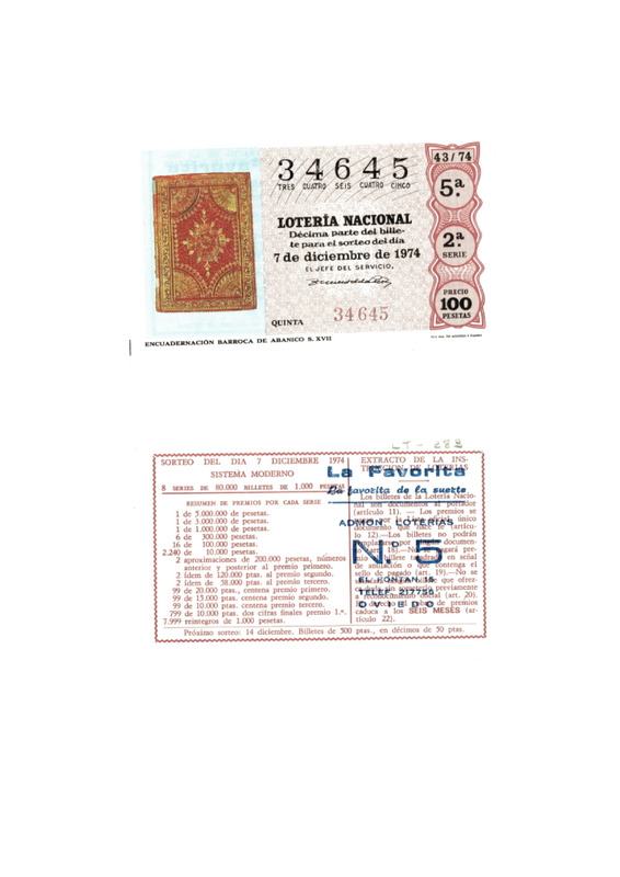 Décimo da Lotaría Nacional de 1974 co motivo "O libro": imaxe que representa unha encadernación barroca de abano do s. XVII. O número do décimo é o 34645 / ANVERSO. Impresión / 34645 / Lotería Nacional. Décima parte del billete para el sorteo del día 7 de diciembre de 1974 / El jefe del servicio (sinatura) / Quinta / 34645 / 43/74 /5ª / 2ª serie / Precio 100 pesetas / Encuadernación barroca de abanico del s. XVII (imaxe) / Fca. Nal. de Moneda y Timbre / REVERSO. Impresión / Sorteo del día 7 diciembre 1974. Sistema moderno. 8 series de 80.000 billetes de 1.000 pesetas. (Resumo de premios) / Extracto de la instrucción de Loterías (texto) / Próximo sorteo: 14 diciembre. Billetes de 500 ptas., en décimos de 50 ptas