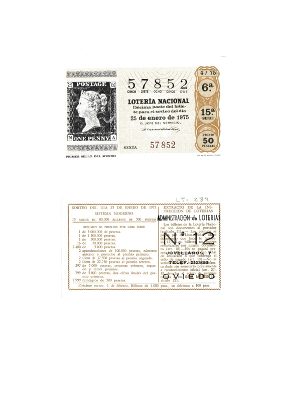 Décimo da Lotaría Nacional de 1975 co motivo "A filatelia": imaxe que representa o primeiro selo do mundo emitido o día 1 de maio de 1840 coñecido como "Penique Negro". O número do décimo é o 57852 / ANVERSO. Impresión / 57852 / Lotería Nacional. Décima parte del billete para el sorteo del día 25 de enero de 1975 / El jefe del servicio (sinatura) / Sexta / 57852 / 4/75 / 6ª / 15ª serie / Precio 50 pesetas / Primer sello del mundo (imaxe) / Fca. Nal. de Moneda y Timbre / REVERSO. Impresión / Sorteo del día 25 de enero de 1975. Sistema moderno. 15 series de 80.000 billetes de 500 pesetas. (Resumo de premios) / Extracto de la instrucción de Loterías (texto) / Extracto de la instrucción de Loterías (texto) / Próximo sorteo: 1 de febrero. Billetes de 1.000 ptas., en décimos a 100 ptas